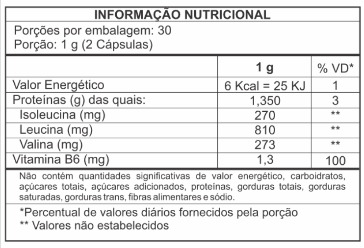 INGREDIENTES: Leucina, Valina, Isoleucina, Vitamina B6 (cloridrato de piridoxina), Aerosil® (dióxido de silício), estearato de magnésio, silicato de magnésio e celulose microcristalina, gelatina, corante laranja e água.
